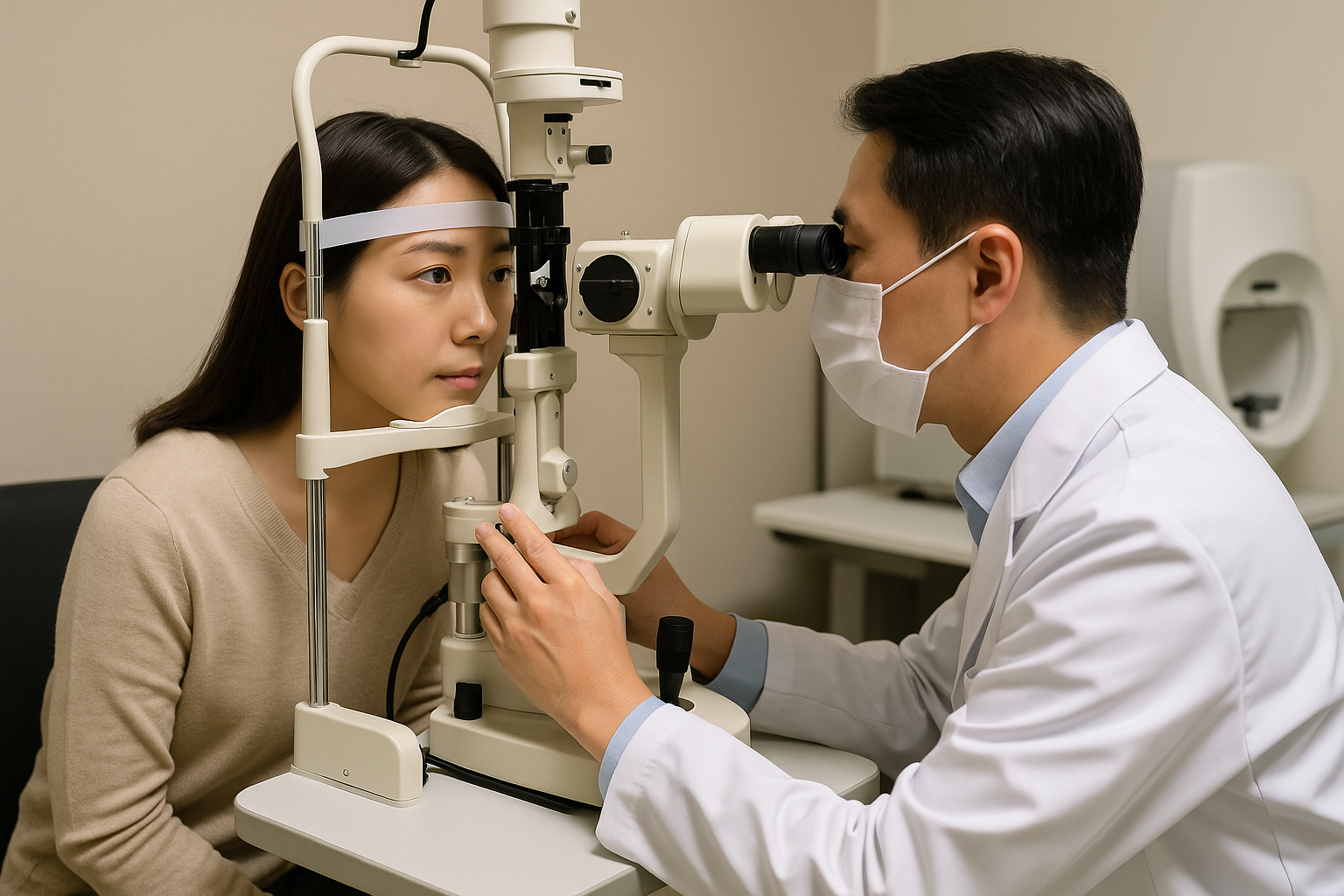 안압검사와 시야검사를 받는 안과 진료 장면