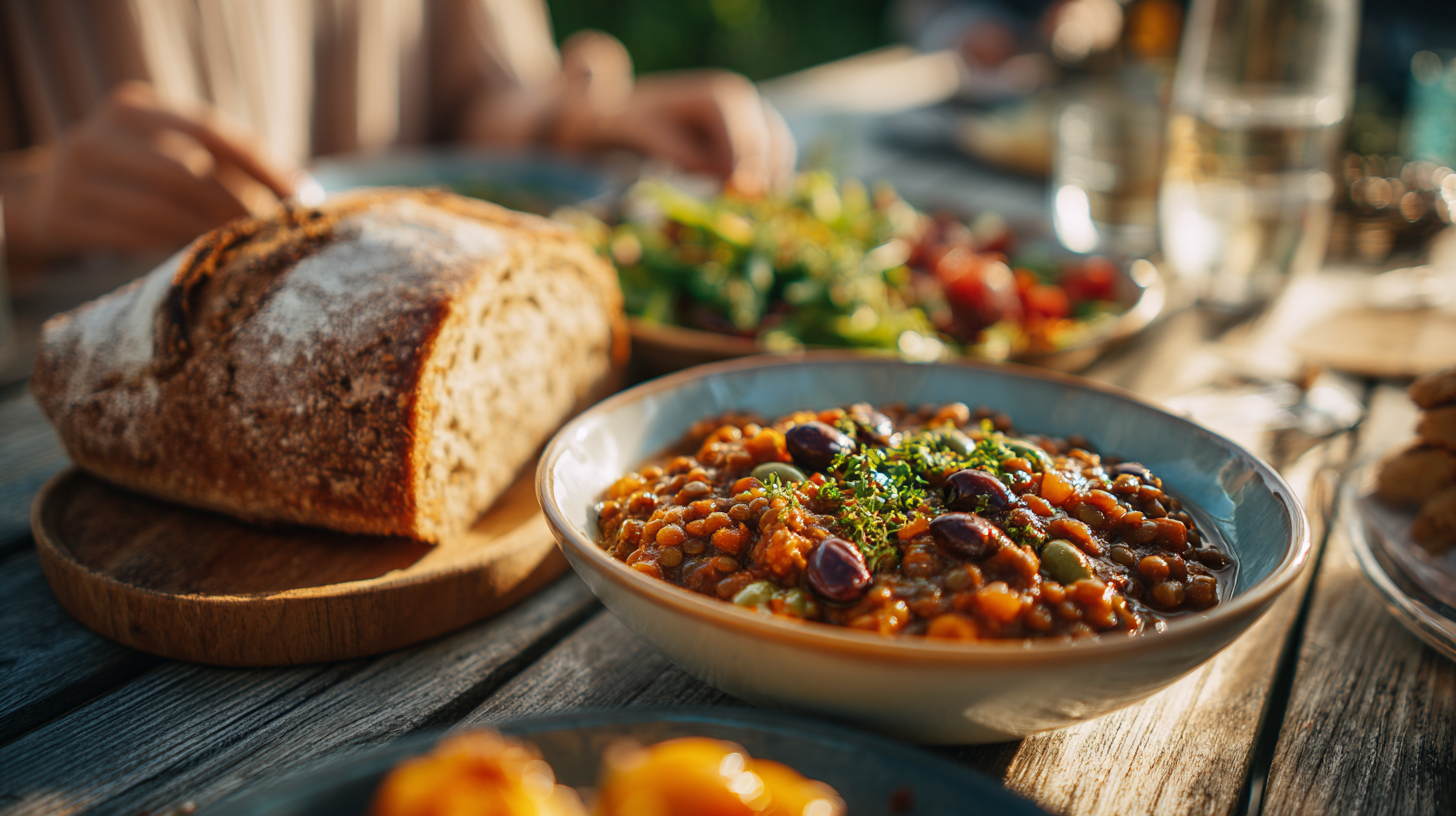 블루존의 건강 식단과 공동체 생활을 보여주는 소박한 식탁. 렌틸콩 스튜 등 장수 비결이 담긴 음식