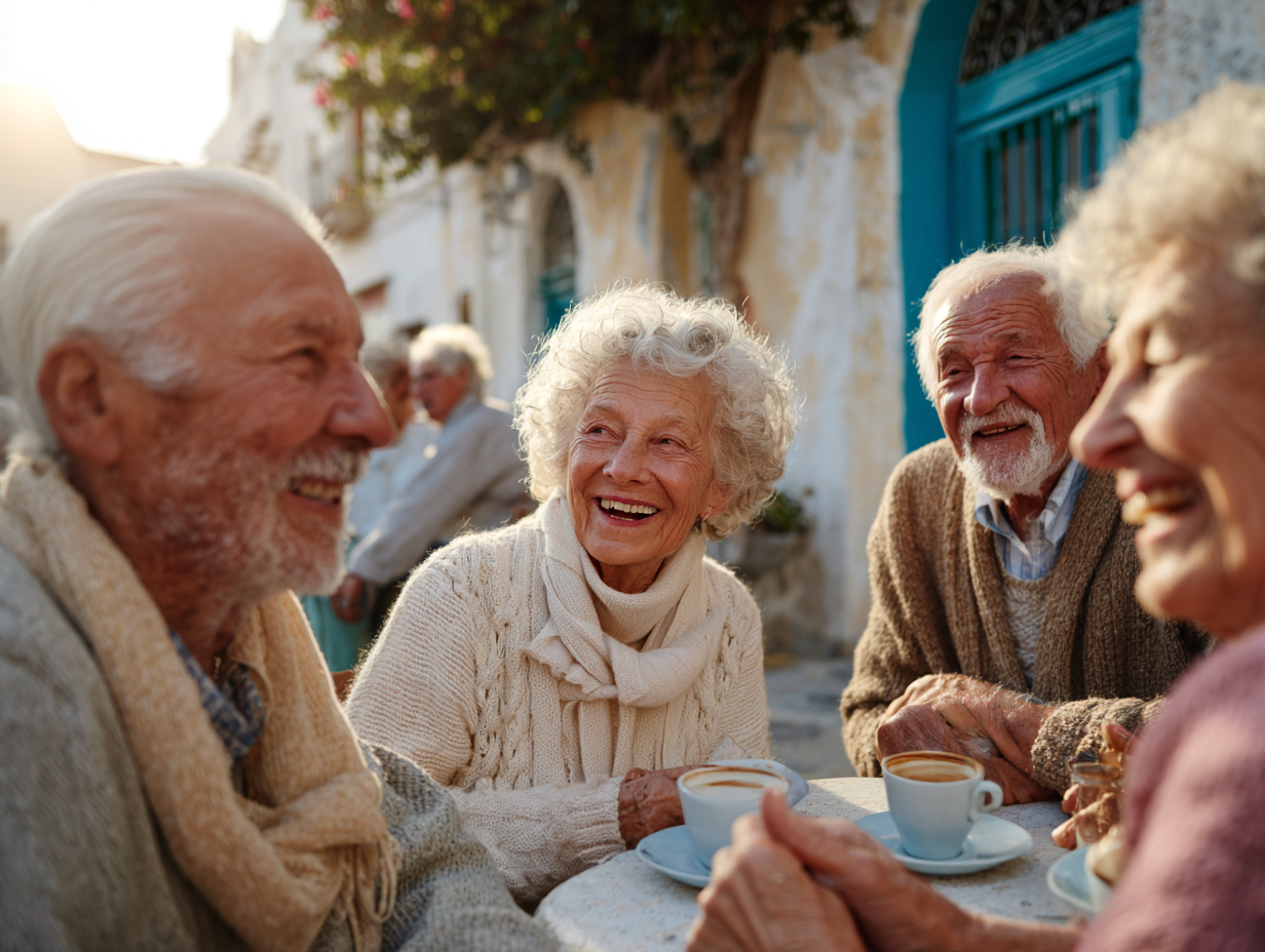 블루존의 활기찬 공동체 생활을 보여주는, 노천카페에 모여 담소를 나누는 노인들의 행복한 모습