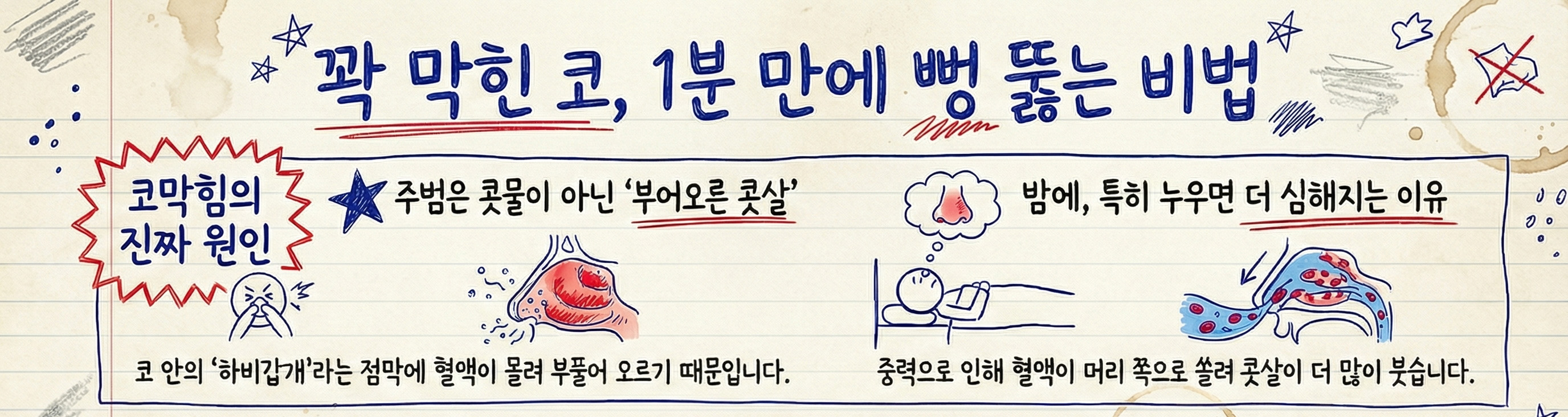 코막힘의 진짜 범인은 콧물이 아니라 부어오른 점막입니다. 중력 활용, 교감신경 자극, 신경 반사, 비강 확장 패치 등 5가지 잘 때 비염 코막힘 뚫는 비법을 공개합니다.